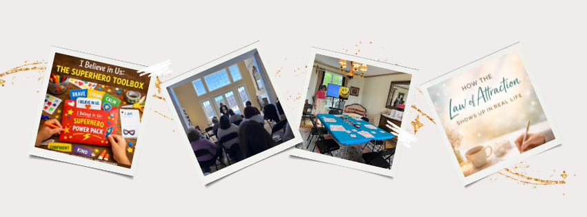 A playful, heart-centered confidence experience designed to strengthen the connection between children and their caregivers while building positive self-belief. Participants create a personal Super Hero Toolbox — a take-home resource filled with empowering words, characters, and reminders to return to anytime encouragement is needed.
